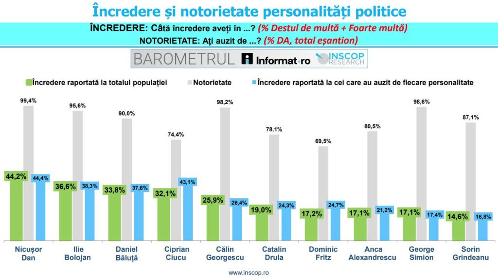 Sondajul a măsurat și încrederea în personalități politice raportată la totalul populației, respectiv la cei care au auzit de fiecare personalitate.