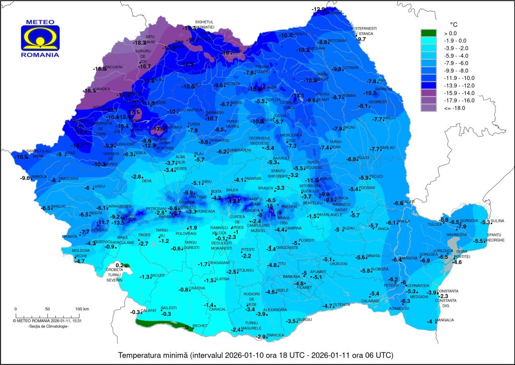 A fost foarte rece în diverse locuri din țară: duminică minima a fost de -18,3 C la Satu Mare, miercuri au fost -14,1 C la Padeș (jud Gorj), iar luni au fost -16,2 C la Sânnicolau Mare, conform hărților ANM.