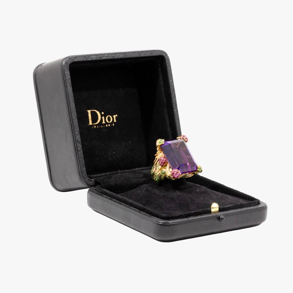 „Personaj-vedetă” în noile expoziții dedicate licitațiilor de la Palatul Cesianu-Racoviță este și un excepțional și unic inel Dior, denumit „Joyeuse”, un adevărat manifest al exuberanței cromatice, care are un preț de pornire de 37.000 de Euro (la jumătate față de cel de listă – 72.000 de Euro!). Creat în universul Dior Joaillerie, fondat în 1998 sub conducerea artistică a lui Victoire de Castellane, inelul impresionează printr-un ametist uriaș (de circa 75,29 carate), montat într-o construcție sculpturală din aur galben de 18 carate și înconjurat de 177 de diamante și numeroase alte pietre prețioase – tsavorite, rubine și safire roz.