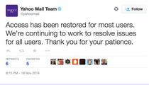 Marti, 18 noiembrie, echipa tehnica a Yahoo a lasat un mesaj pe pagina oficiala de Twitter, informand milioane de utilizatori ai serviciului de Mail ca problemele au fost rezolvate pentru majoritatea utilizatorilor si ca se incearca rezolvarea problemelor pentru toti utilizatorii de Yahoo Mail.