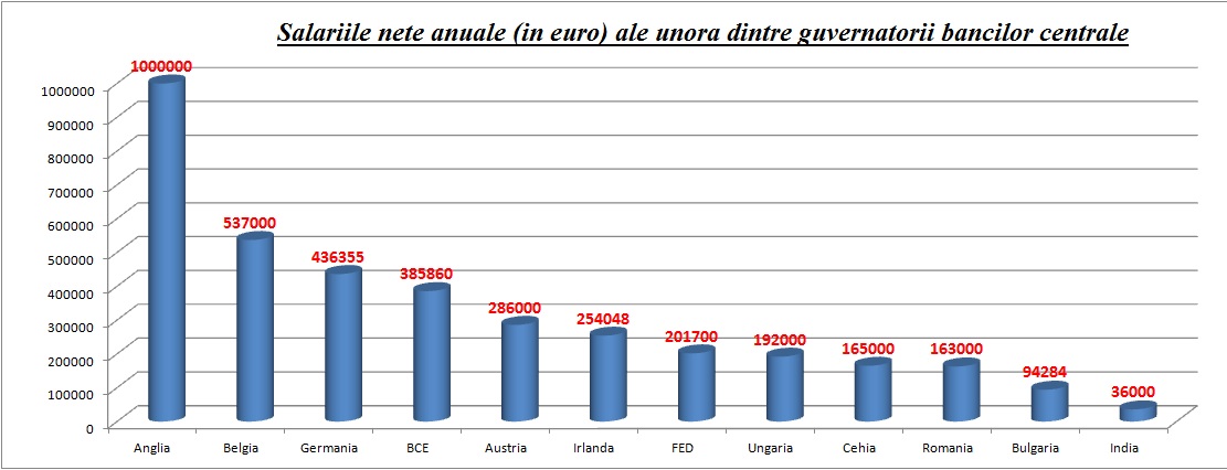 • Bulgaria. In Bulgaria, guvernatorul Dimitar Radev si-a taiat singur salariul la aproape o treime fata de cel al predecesorului sau. Radev ia 7857 de euro lunar, fata de peste 22.000 de euro cat lua fostul guvernator. Sursa. La bulgari, Guvernatorul si viceguvernatorii sunt alesi de Parlament, dar ceilalti 3 membri ai boardului sunt numiti de Presedinte. Potrivit Statutului bancii centrale.