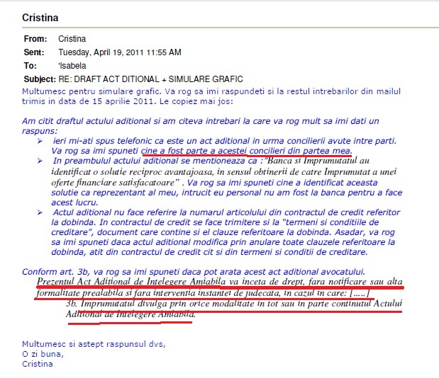 „Va rog sa observati ca nici macar in 2011, la aproape un an de la intrarea in vigoare a OUG 50/2010, BCR a continuat sa imi propuna un document prin care comisionul de risc si de administrare se calculeaza tot la valoarea creditului, NU la soldul creditului. Nu am acceptat acest act aditional, intrucit nu am considerat echitabile obligatiile mele in comparatie cu cele ale bancii. „Imprumutatul se obliga sa nu initieze in viitor nicio alta procedura administrativa, litigioasa sau de alta natura impotriva Bancii care isi gaseste temeiul in prevederile prezentului Contract de Credit; Imprumutatul se obliga sa pastreze confidentialitatea deplina a tuturor termenilor prezentului Act Aditional de Intelegere Amiabila”, mai spune Cristina.