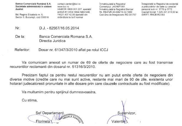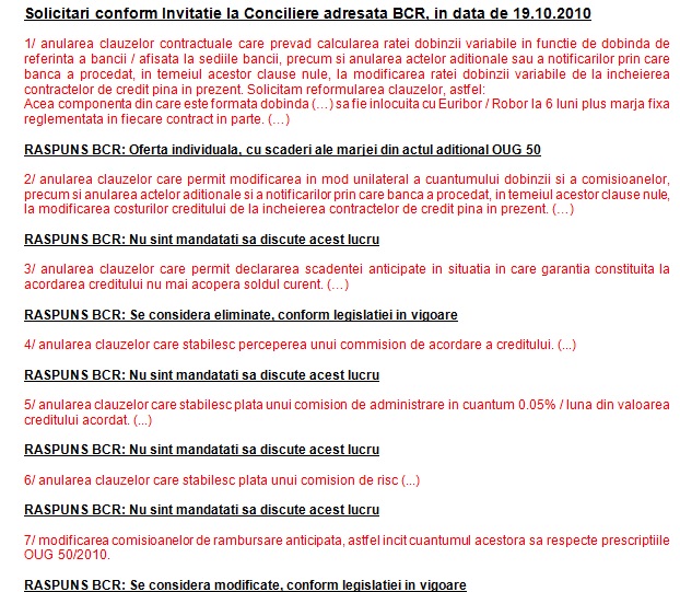 La solicitarea trimisa de Casa de Avocatura Piperea si Asociatii de conciliere inainte de depunerea cererii de chemare in judecata, in octombrie 2010, raspunsurile punctuale ale reprezentatilor BCR au fost: