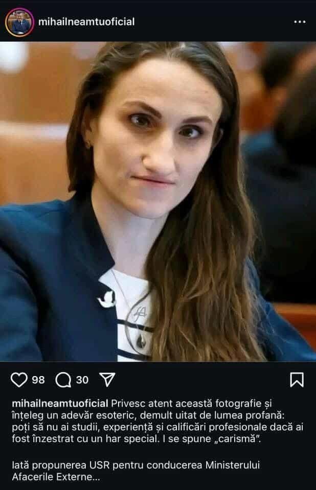 Neamțu a postat fotografia pe Instagram, în seara zilei de luni, însoțită de textul: „Privesc atent această fotografie și înțeleg un adevăr esoteric, demult uitat de lumea profană: poți să nu ai studii, experiență și calificări profesionale dacă ai fost înzestrat cu un har special. I se spune «carismă». Iată propunerea USR pentru conducerea Ministerului Afacerilor Externe…”. Șeful Comisiei de Cultură din Camera Deputaților a șters ulterior postarea de pe rețeaua socială.