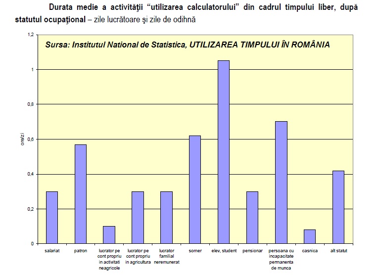 In primul rand, facem precizarea ca discutam despre medii. Asta inseamna ca daca din doua persoane, una sta la computer 10 ore iar alta nu sta deloc, media utilizarii e de 5 ore. Acum, sa spunem ca romanii aloca hobby-urilor si utilizarii calculatorului in medie 27 de minute zilnic. Din acest timp, 18 minute (67%) este destinat activitatilor de recreere prin utilizarea calculatorului. Barbatii utilizeaza calculatorul mai mult decat femeile, iar cel mai mult timp liber il petrec in fata calculatorului copiii de 10-14 ani, 40 de minute zilnic (aproape in mod egal fetele si baietii) si persoanele de 15-24 ani, care aloca in medie o ora zilnic.