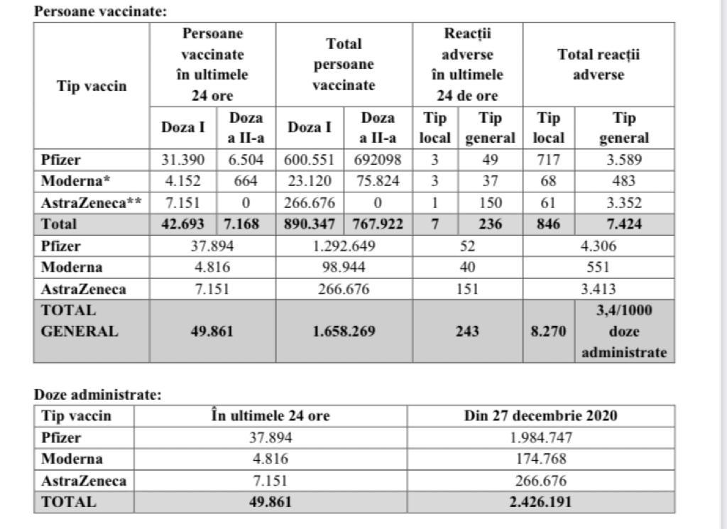 De la debutul campaniei, în 27 decembrie, în România s-au vaccinat 1.658.269 de persoane – 1.292.649 cu Pfizer, 98.944 cu Moderna și 266.676 cu AstraZeneca. În total, au fost raportate 8.270 de reacții adverse.
