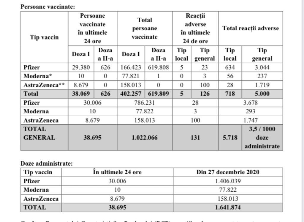 În ultimele 24 de ore, au fost vaccinate 38.695 de persoane, cele mai multe cu vaccinul Pfizer. 8.679 de persoane au fost vaccinate cu AstraZeneca şi 10 cu Moderna. S-au înregistrat 131 de reacţii adverse, cele mai multe – 100 – la persoane vaccinate cu serul AstraZeneca.