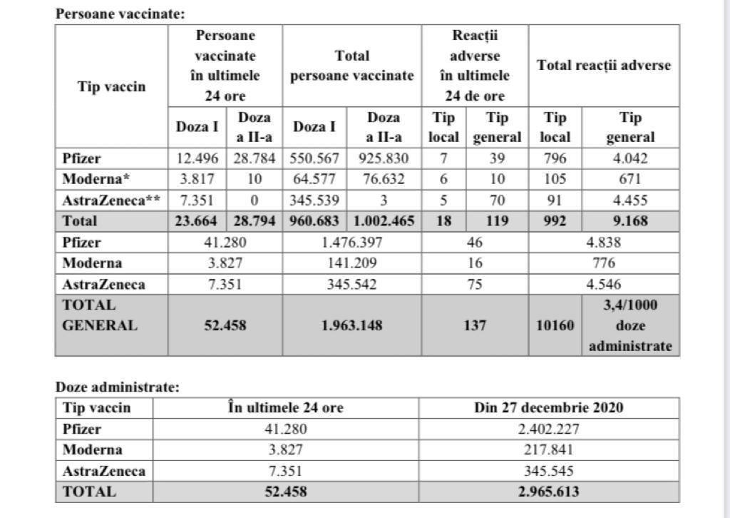 De la debutul campaniei, în 27 decembrie, au fost vaccinate 1.963.148 de persoane -1.476.397 cu serul Pfizer, 345.542 cu AstraZeneca și 141.209 cu vaccinul Moderna. În total, au fost raportate 10.160 de reacții adverse – după vaccinarea cu serul Pfizer, 4.546 după vaccinarea cu serul AstraZeneca și 776 după vaccinarea cu serul Moderna.