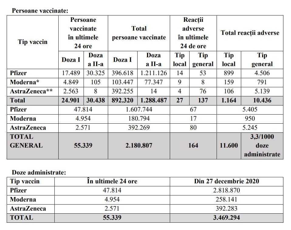 În ultimele 24 de ore s-au înregistrat 164 de reacții adverse – 67 la Pfizer, 17 la Moderna și 80 la AstraZeneca. De la debutul campaniei de vaccinare, numărul total al reacțiilor adverse a fost de 11.600 (3,3/1000 doze administrate). Alte 92 reacții adverse sunt în curs de investigare.