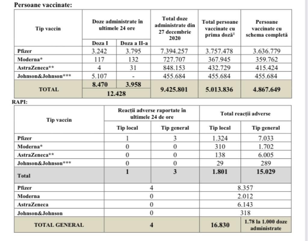 Din 27 decembrie 2020, de la începutul campaniei de vaccinare anti-COVID în România, s-au vaccinat 5.013.836 de persoane, dintre care 4.867.649 au primit schema completă. De la debutul campaniei de vaccinare, s-au înregistrat 16.830 de reacţii adverse la vaccinurile anti-COVID, 1.801 de tip local şi 15.029 de tip general.