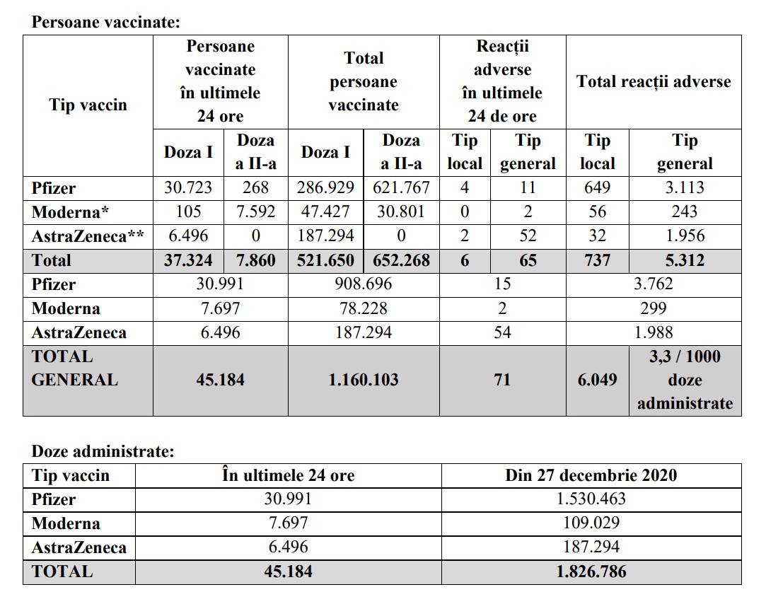 Astfel, conform informațiilor transmise sâmbătă seară de Comitetul naţional de coordonare a activităților privind vaccinarea împotriva Covid-19 (CNCAV), în ultimele 24 de ore au fost administrate 45.184 de doze, dintre care 37.324 ca primă doză și 7.860 ca rapel (cu Pfizer și Moderna).