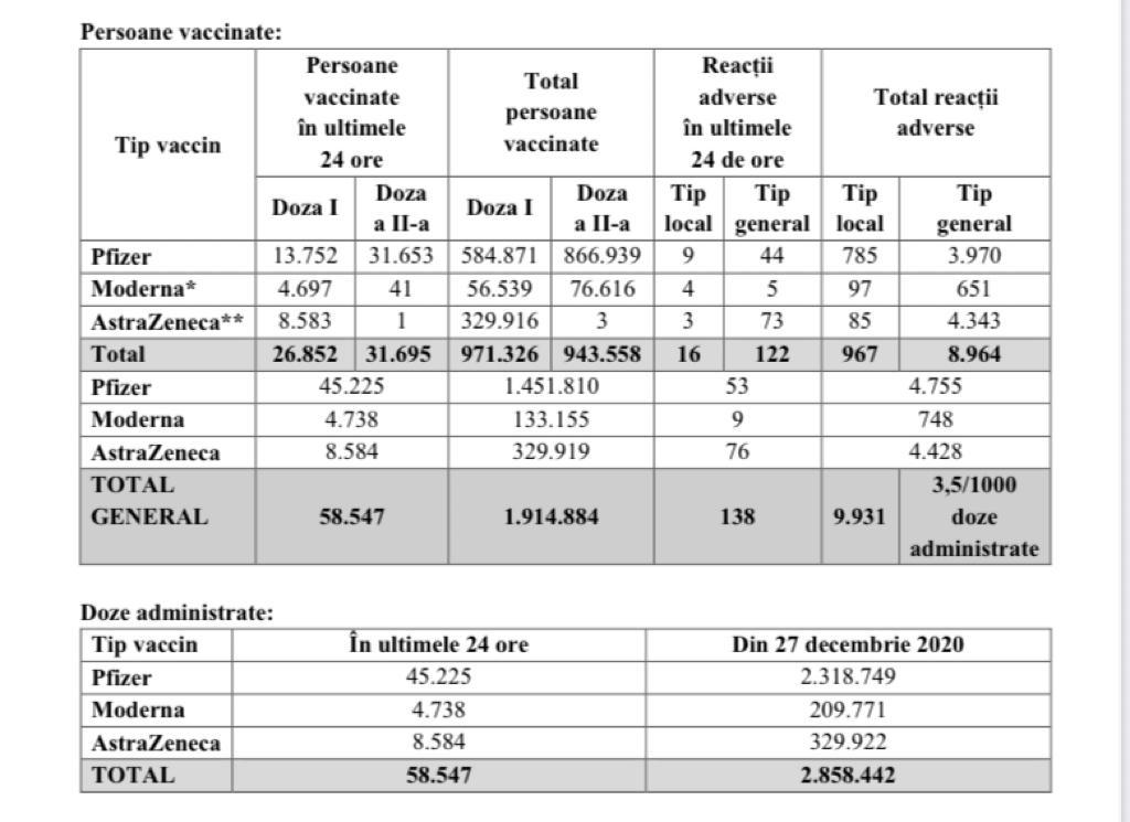 De la debutul campaniei de vaccinare, în 27 decembrie, s-au vaccinat 1.914.884 de persoane – 1.451.810 cu Pfizer, 329.919 cu AstraZeneca și 133.155 cu Moderna.