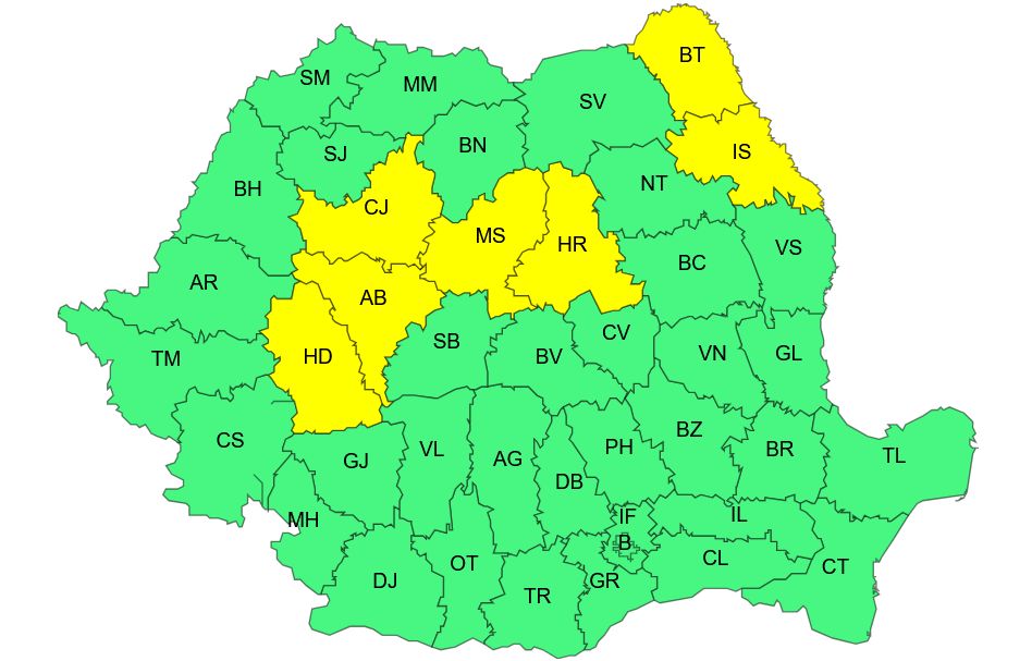 Pe parcursul zilei de marți, valul de frig va persista în județele Botoșani, Iași, Harghita, Mureș, Cluj, Alba și Hunedoara. Aici, este valabil un cod galben de ger, și vor continua să se înregistreze temperaturi deosebit de scăzute (în medie cu 5…9 grade mai mici decât cele normale acestei perioade, cu valori ce se vor încadra între -8 și -4 grade, mai scăzute până în jurul a -10 grade, pe văi și în depresiuni, unde gerul va persista, potrivit ANM.