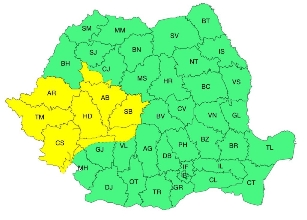 Prima avertizare cod galben de instabilitate atmosferică va fi în vigoare de marți, de la ora 12.00 și până miercuri, la ora 03.00 și va viza zece județe.