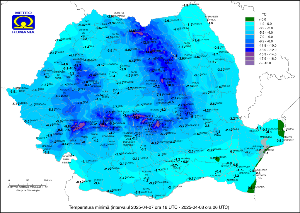 Marți dimineață au fost temperaturi negative peste tot în țară, cu excepția a cinci stații meteo din rețeaua ANM: Constanța Dig, Mangalia, Gura Portiței, Slobozia și Sulina. Dintre acestea, cea mai mare temperatură a fost la Gura Portiței, +1,1 C.