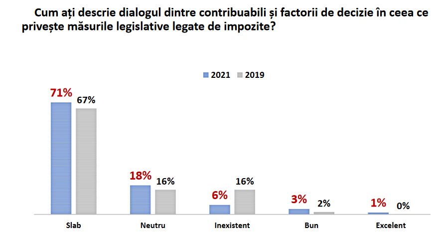 În ceea ce privește neajunsurile legislației fiscale, cele mai multe răspunsuri indică probleme legate de predictibilitatea procesului legislativ în sfera fiscalității, de interpretare unitară a legislației sau lipsa de corelare dintre legislația fiscală și alte legislații care reglementează același domeniu.