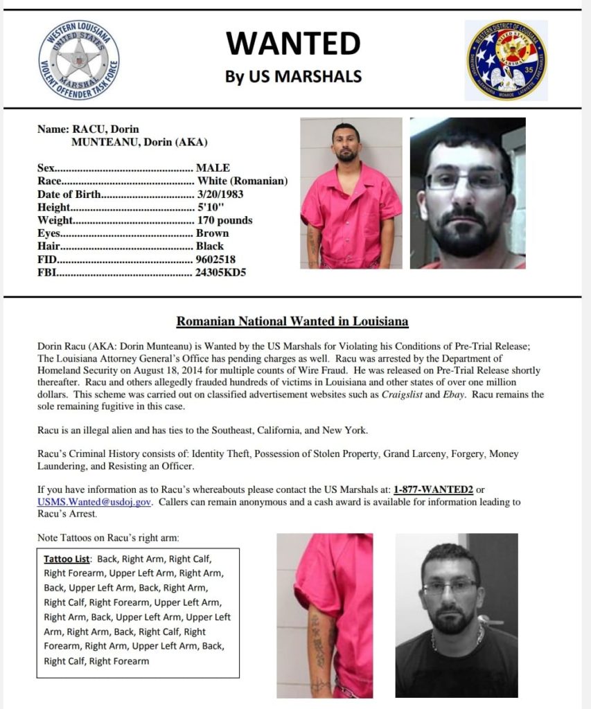 „Dorin Racu este străin ilegal și are legături cu sud-estul regiunii Louisiana, California și New York. Istoricul penal al lui Dorin Racu este: furt de identitate, deținere de bunuri furate, fals, spălare de bani și opunere de rezistenţă în fata unui ofițer,” arată Biroul Procurorului General din Louisiana.