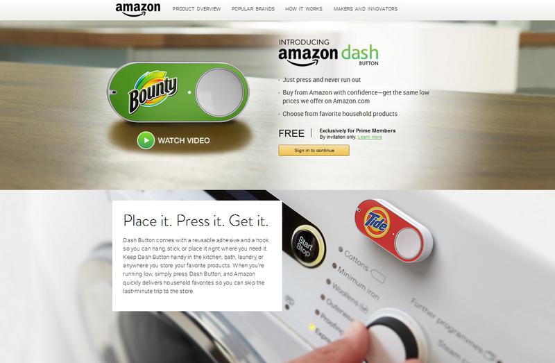 Retailerul Amazon a lansat pentru o parte a clientilor din SUA un buton numit Dash care poate fi lipit in diverse locuri din casa si apasat pentru a comanda rapid cosmetice, detergent, lame de ras, prosoape de hartie sau cafea. Butonul are baterie si WiFi, iar apasarea lui lanseaza comanda care trebuie apoi confirmata pe smartphone sau PC.