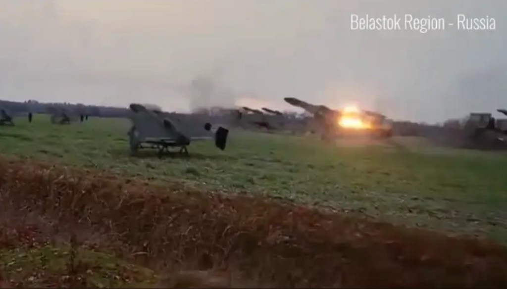 În clipul video realizat de ucraineni apare o simulare cum de pe un câmp din Rusia sunt lansate zeci sau sute de drone Geran-3 (o evoluție a dronelor Geran-2 / Shahed-136). Apoi imaginile arată cerul deasupra mai multor orașe europene, survolate de roiuri de drone kamikaze.