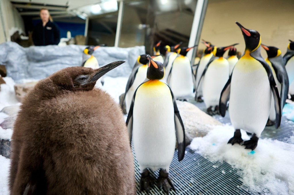 Pesto îşi va pierde în curând puful pentru a-şi dobândi penele de adult, pata galbenă caracteristică pe cap şi aspectul ce evocă un frac negru şi alb al pinguinilor imperiali din Antarctica.