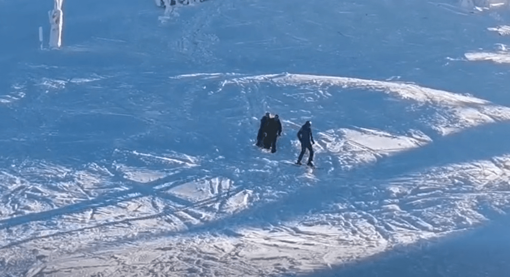 VIDEO Femeie în fustă și palton, coborâtă pe pârtie de un jandarm montan, în Masivul Postăvaru. „Pârtia de schi nu este podium de modă”