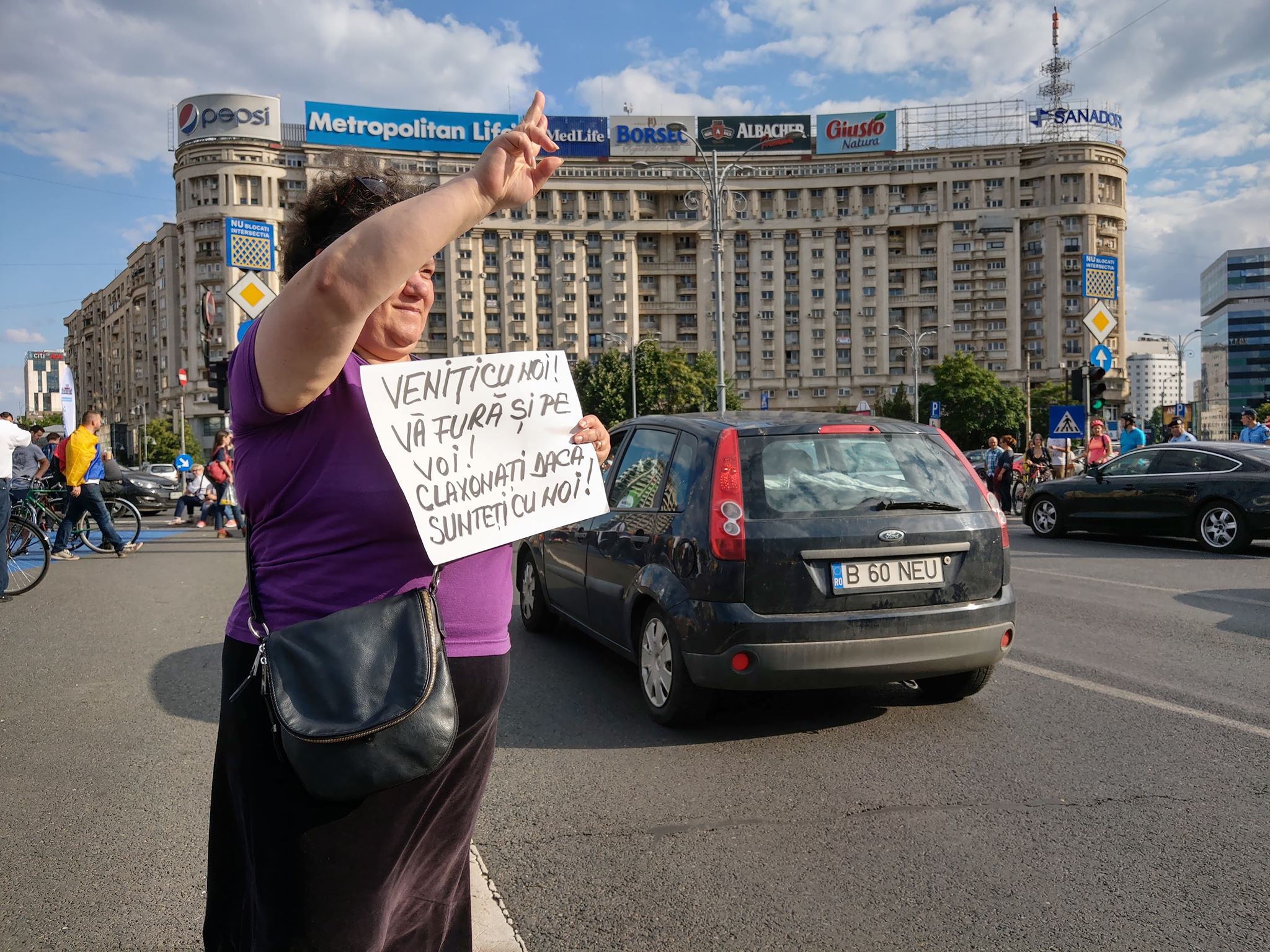 Multe din mașinile care trec prin Piața Victoriei claxonează în semn de susținere.