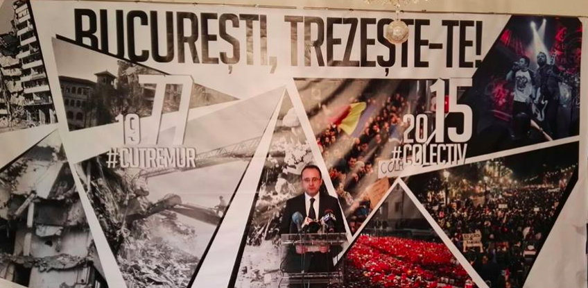 La conferinta de presa in spatele lui Busoi a fost afisat un banner cu imagini de la cutremurul din 1977 si de la Colectiv cu mesajul „Bucuresti, trezeste-te! 1977#cutremur-2015#Colectiv”.