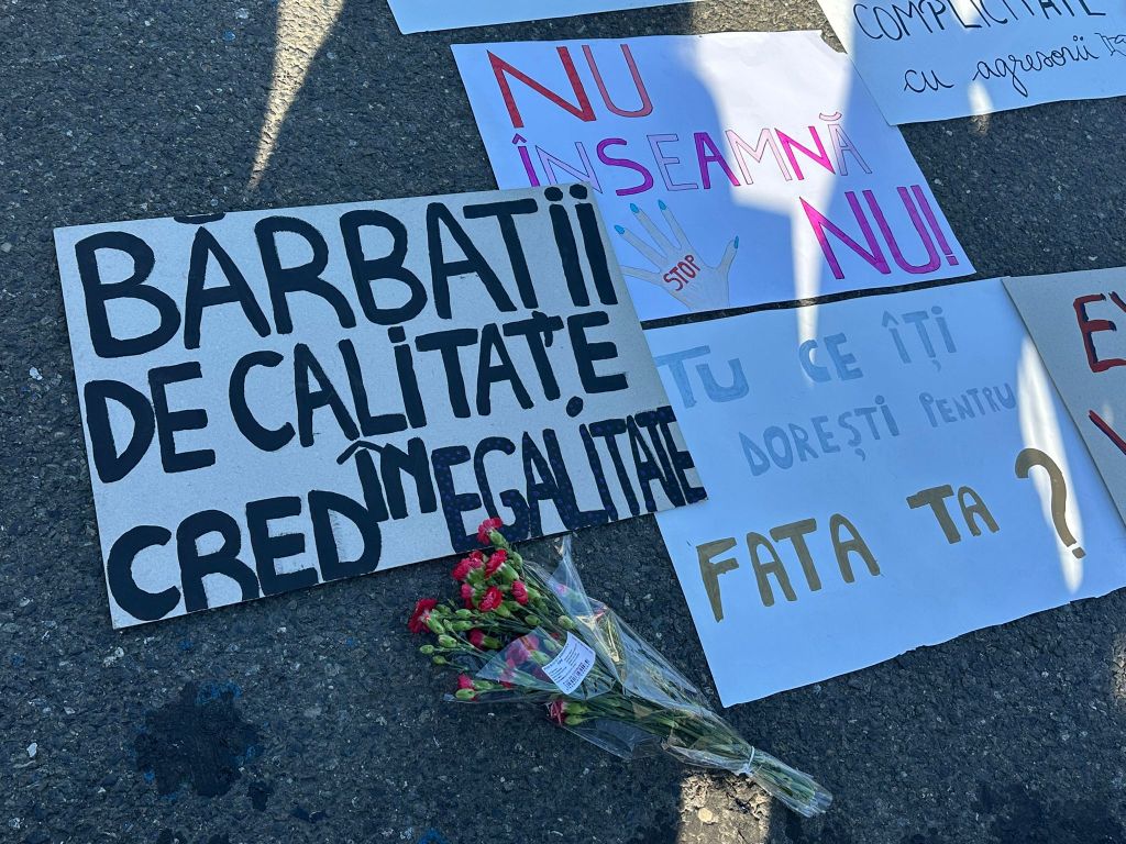 Participanții la eveniment au venit cu pancarte, dar și cu flori și lumânări în memoria tinerei ucise.