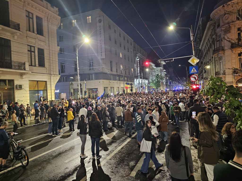 La această oră, Bulevardul Elisabeta este blocat de toți cei care au ieșit să îl susțină pe candidatul independent la alegerile prezidențiale. „Hai să facem loc la troleibuze, consumă curent”, îndeamnă un jandarm. Oamenii s-au retras, pentru câteva momente, pe trotuar, după care au revenit pe carosabil.