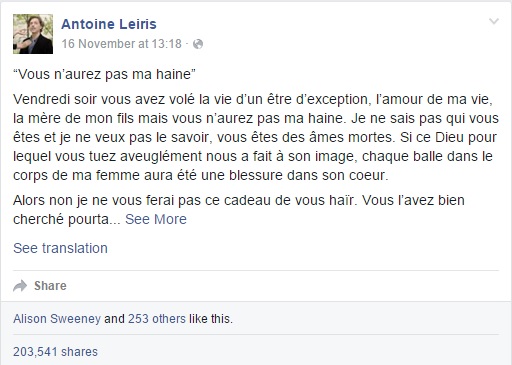 Antoine Leiris a postat mesajul si pe pagina sa de Facebook: