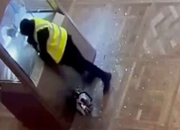 Unul poartă o cagulă neagră şi o vestă galbenă, celălalt este îmbrăcat în negru şi are o cască de motociclist. Apoi, unul dintre cei doi bărbaţi, înarmat cu o polizor, atacă vitrina în care se afla diadema împărătesei Eugénie, pe care reuşeşte să o ia după ce loveşte cu pumnii în geam. Ulterior, el vine în ajutorul celui de-al doilea hoţ care spărgea vitrina alăturată.