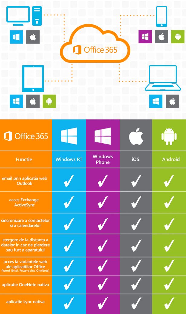 Cu Office 365, modul in care lucrezi in compania ta se schimba radical: chiar daca statia ta de lucru de la birou ruleaza Windows, portabilul Mac OS, tableta iOS si telefonul Android, Office vine cu tine, oriunde ai fi. Pentru fiecare abonament Office 365 pentru afaceri mici si mijlocii, utilizatorii au la dispozitie cinci aparate pe care le pot asocia si folosi pentru a accesa informatiile de care au nevoie. Pe Windows si Mac exista in continuare optiunea de a avea suita Office instalata, inclusa in anumite abonamente, iar pe aparatele mobile non Windows 8 mobile pot fi folosite variantele web ale aplicatiilor. De la Outlook pentru email, Lync pentru comunicatii atat in interiorul companiei cat si in exterior, la oricare dintre celelalte programe Microsoft Office, utilizatorii pot acum lucra pe orice aparat care are un browser modern. In tabelul de mai jos puteti vedea ce functii sunt compatibile cu ce aparate mobile.