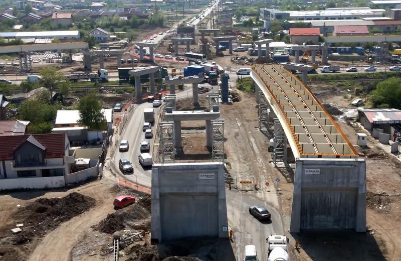 Într-o filmare realizată cu drona pe 10 mai se observă cum o parte din rampele metalice de urcare pe viitorul giratoriu au fost deja înalțate pe piloni, iar separat se ridică și restul pilonilor viitorului pasaj.