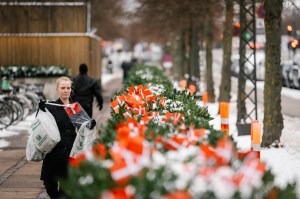 The quiet and very low-key atmosphere around Kastellet is now replaced by more talk, while many cling to Danish flags in the cold.