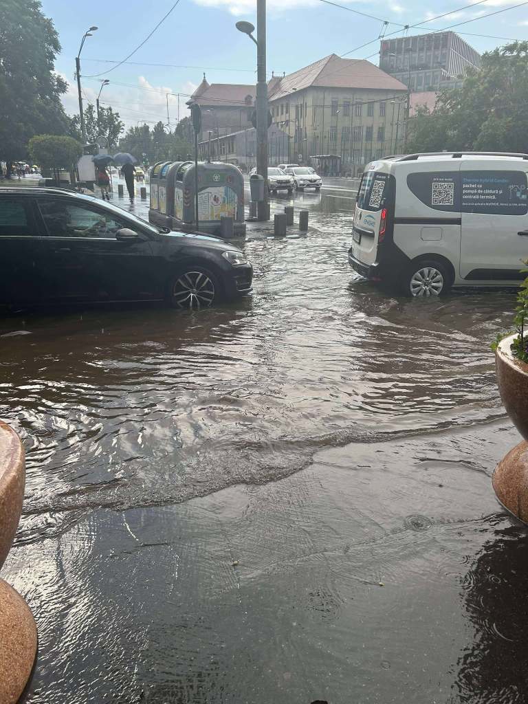 În zona Tineretului, la ieșirea de la metrou de la „Șincai”, mașinile își croiau drum prin apa care s-a adunat pe carosabil în timpul ploii care a început în jurul orei 18:00.