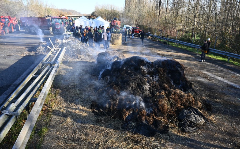 Pour protester contre la politique sanitaire en matière de lutte contre la dermatose, ces agriculteurs bloquent l’autoroute A64 avec des bottes de paille.