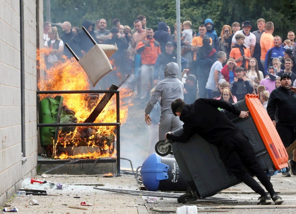 Imaginile de la fața locului au arătat un coș de gunoi în flăcări și protestatari, unii acoperiți de steaguri ale UK și ale Sfântului Gheorghe, care scandau: „Scoateți-i afară”. La un moment dat, demonstranții păreau gata să intre în forță în hotel, scrie The Guardian.