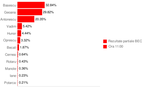 VIDEO Rezultate partiale BEC, ora 11:00: Traian Basescu – 32,84%, Mircea Geoana – 29,82% , Crin Antonescu – 20,35%