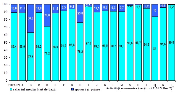 - Analiza raportului dintre salariul de baza si salariul realizat, pe activitati economice, arata ca cele mai mari sporuri si adaosuri se regasesc în activitatile: industria extractiva (36,8%), productia si furnizarea de energie electrica si termica, gaze, apa calda si aer conditionat (28,8%), transport si depozitare (23,8%).