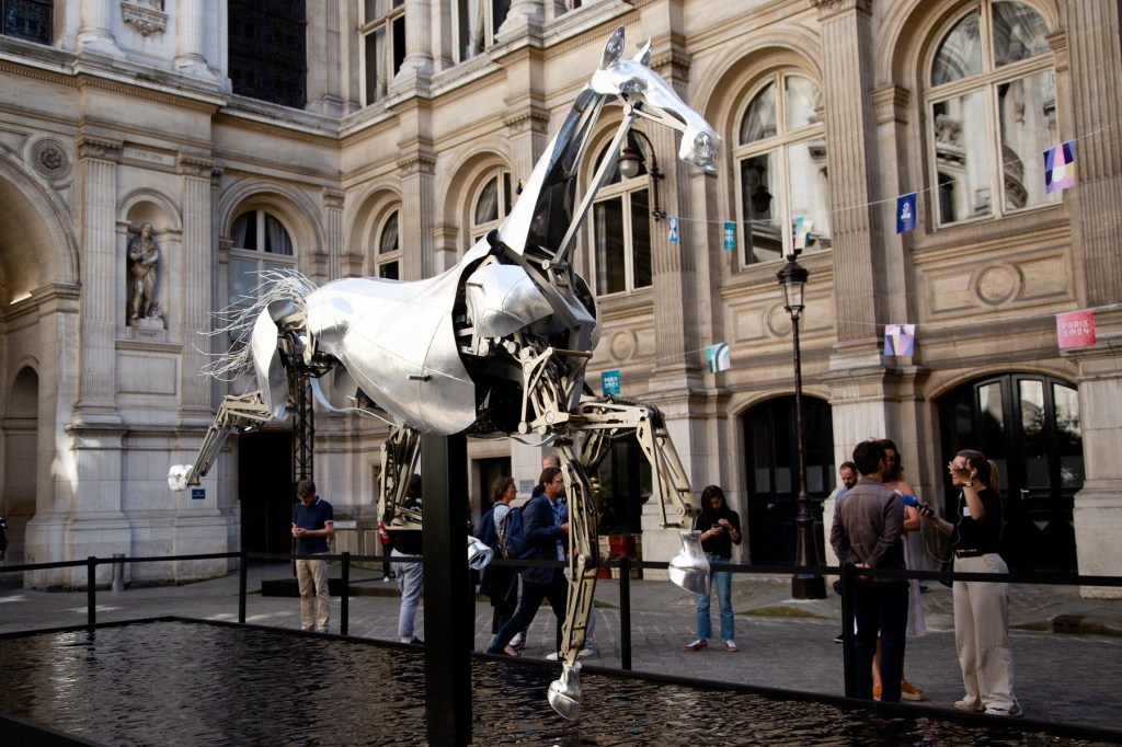 Începând din 26 august, calul de metal a fost expus gratuit la Primăria Parisului.