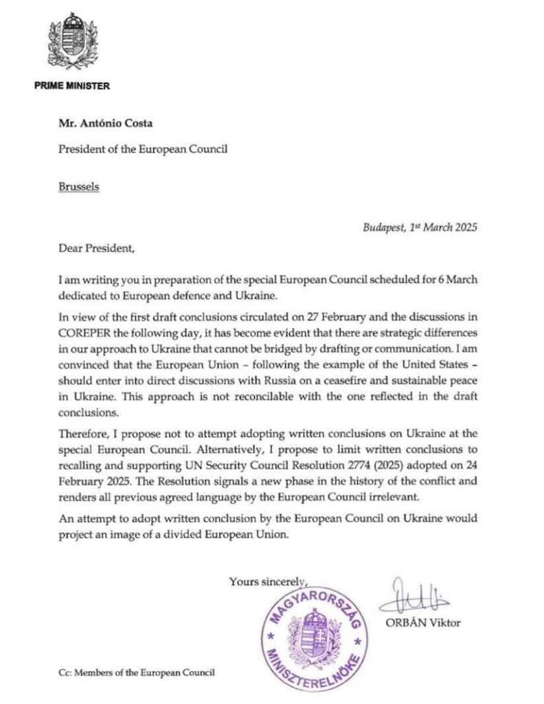 Prim-ministrul Ungariei l-a avertizat pe președintele Consiliului European, Antonio Costa, într-o scrisoare transmisă sâmbătă, că ar putea bloca adoptarea de concluzii scrise cu privire la Ucraina în reuniunea din 6 martie dacă acestea vor fi sub forma proiectului vehiculat la Bruxelles, în care, potrivit Financial Times, se vorbește despre un sprijin militar suplimentar destinat Kievului și o creștere rapidă a bugetelor dedicate apărării din statele UE.