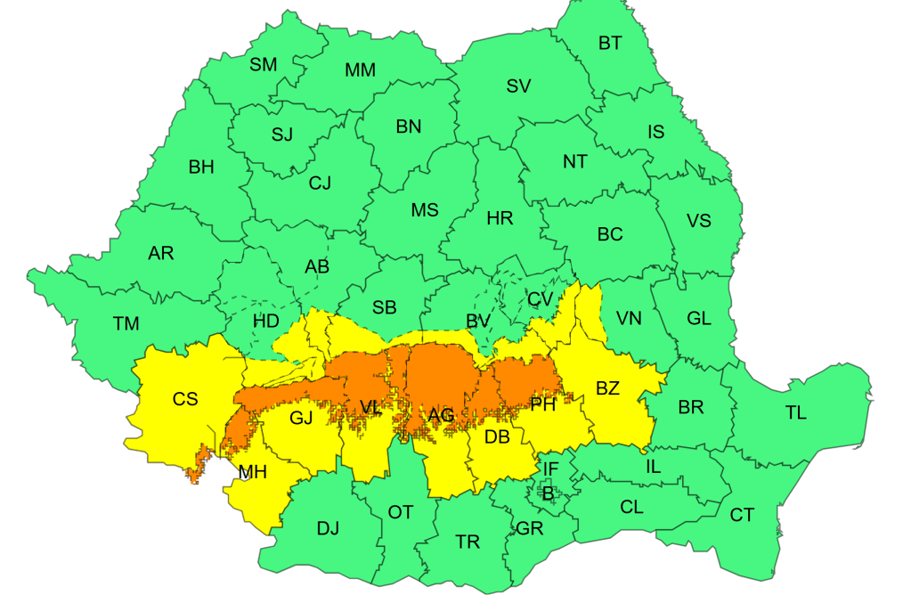 Codul portocaliu de precipitații importante cantitativ, strat de zăpadă și viscol la peste 1700 m vizează zona deluroasă și montană a județelor Mehedinți, Gorj, Vâlcea, Argeș, Dâmbovița și Prahova.