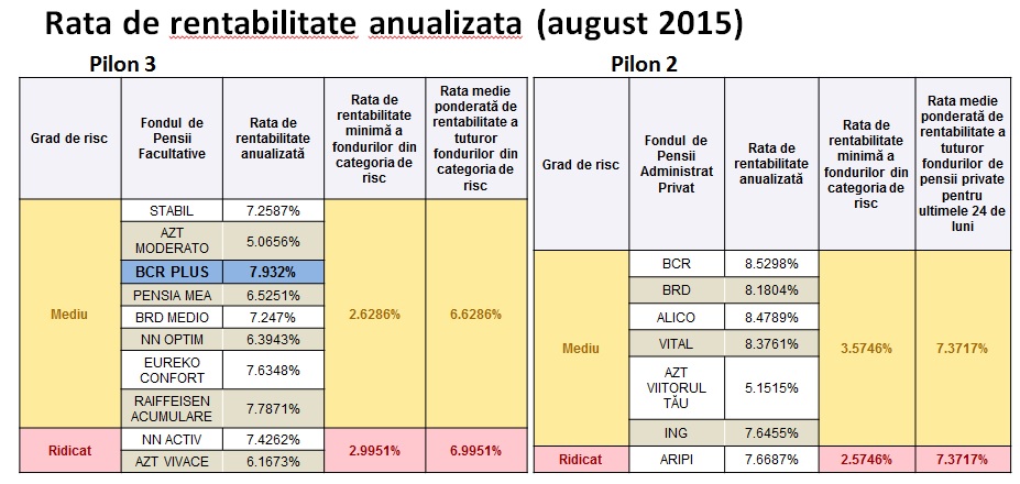 „La finalul lunii august 2015, Fondul de Pensii Facultative BCR Plus a inregistrat o in ultimii 2 ani rata de rentabilitate anualizata de 7.932%, in conditiile in care depozitele bancare ofera randamente de sub 2%”, a explicat si Melania Mirea, Director Executiv BCR Pensii.
