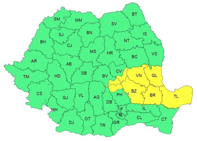 Meteorologii au emis miercuri și o atenţionare cod galben de instabilitate atmosferică temporar accentuată valabilă astăzi, între orele 12.00 şi 23.00, în judeţele Vrancea, Galaţi, Tulcea, Brăila, Buzău şi parţial în Prahova, Braşov şi Covasna.