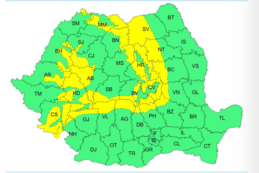 ANM a emis și o atenționare cod galben, valabilă de joi, 1 ianuarie, ora 23:00, până vineri, 2 ianuarie, ora 18:00. În acest interval, vântul va sufla cu putere în Carpații Occidentali, Orientali și Meridionali, cu viteze de 70-90 km/h, iar la altitudini de peste 1.700 de metri, rafalele pot ajunge la 90-100 km/h. Ninsoarea va fi viscolită, iar vizibilitatea va fi redusă.