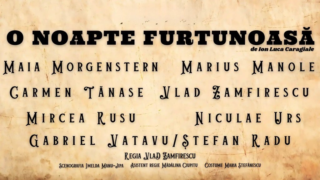 Duminică, pe 12 aprilie, Teatrul Național „Ion Luca Caragiale ”din București are în program „O noapte furtunoasă”, într-o variantă de seară de Paște care nu schimbă textul, dar schimbă puțin contextul. Spectacolul începe la 20:00, în Sala Ion Caramitru, cu o montare semnată de Vlad Zamfirescu, care merge pe o energie destul de directă și pe mecanica deja cunoscută a comediei lui Ion Luca Caragiale. Biletele sunt disponibile online, iar prețurile încep de la 195 lei.