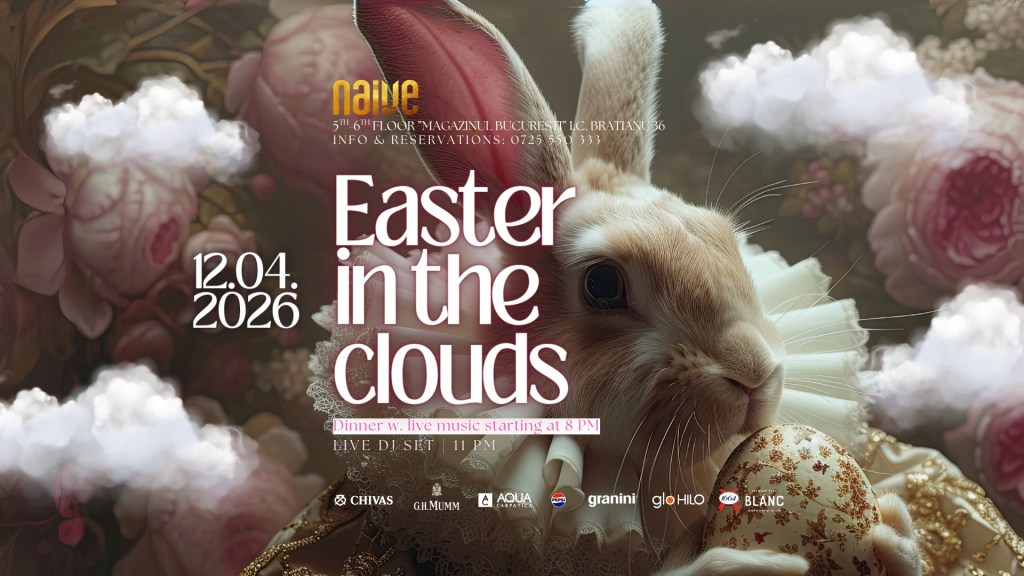 Tot duminică, într-o variantă mai organizată, Naive propune „Easter in the Clouds”, o combinație de cină, muzică live și o trecere lentă spre partea de noapte. E pe două niveluri, la etajele superioare ale Magazinului București, iar rezervarea mesei e obligatorie. Nu există preț fix anunțat pentru acces.