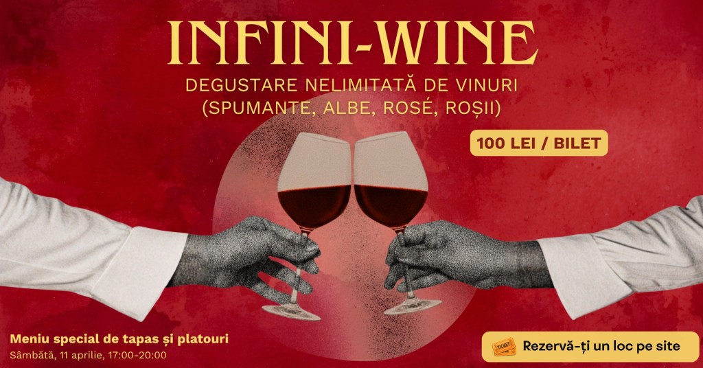 Ziua de sâmbătă o poți continua, pe la 17:00, cu o degustare de vinuri la Corks Cozy Bar. INFINI-WINE e genul de eveniment care nu se complică: plătești biletul (100 de lei), primești acces la o selecție destul de largă de vinuri și îți faci singur ritmul. Nu e despre expertiză, ci mai degrabă despre comparații simple, de tipul „ăsta merge” sau „mai încercăm altceva”. Există și tapas, cât să nu devină totul prea tehnic sau amețitor.