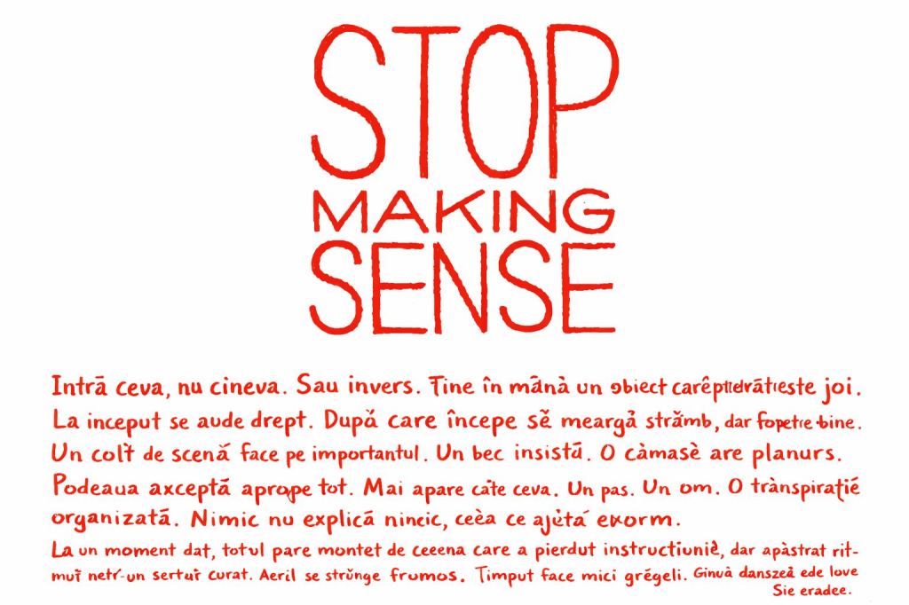 Duminică, orașul încetinește și mai mult și cam peste tot o să fie închis. Dar, la Trei Bețivi Bar, de la 20:00, o să fie proiectat documentarul „Stop Making Sense” (1984), un film-concert de referință care documentează concertele trupei Talking Heads la Pantages Theatre din Hollywood, pe parcursul a trei seri din decembrie 1983. Regizat de Jonathan Demme, este considerat pe scară largă cel mai bun film-concert realizat vreodată, surprinzând energia trupei în formulele cu David Byrne, Tina Weymouth, Chris Frantz și Jerry Harrison.