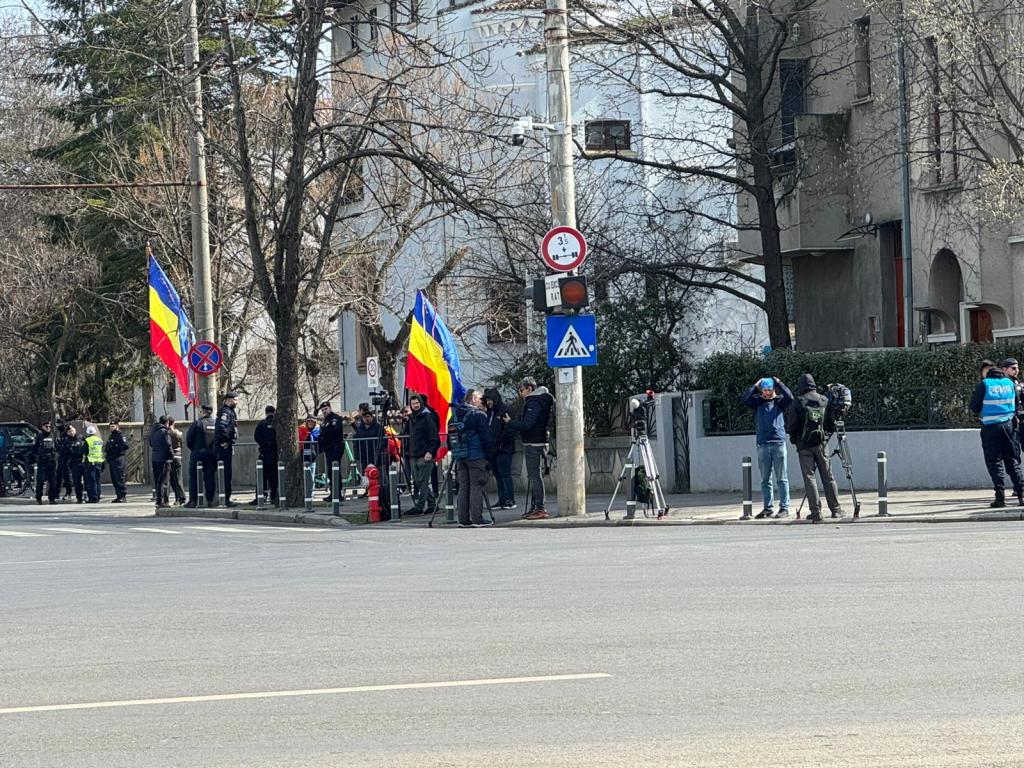 Aceștia strigă „Noi vrem pace, nu război” și „Călin Georgescu președinte”. Ei au venit cu mai mult steaguri tricolore.